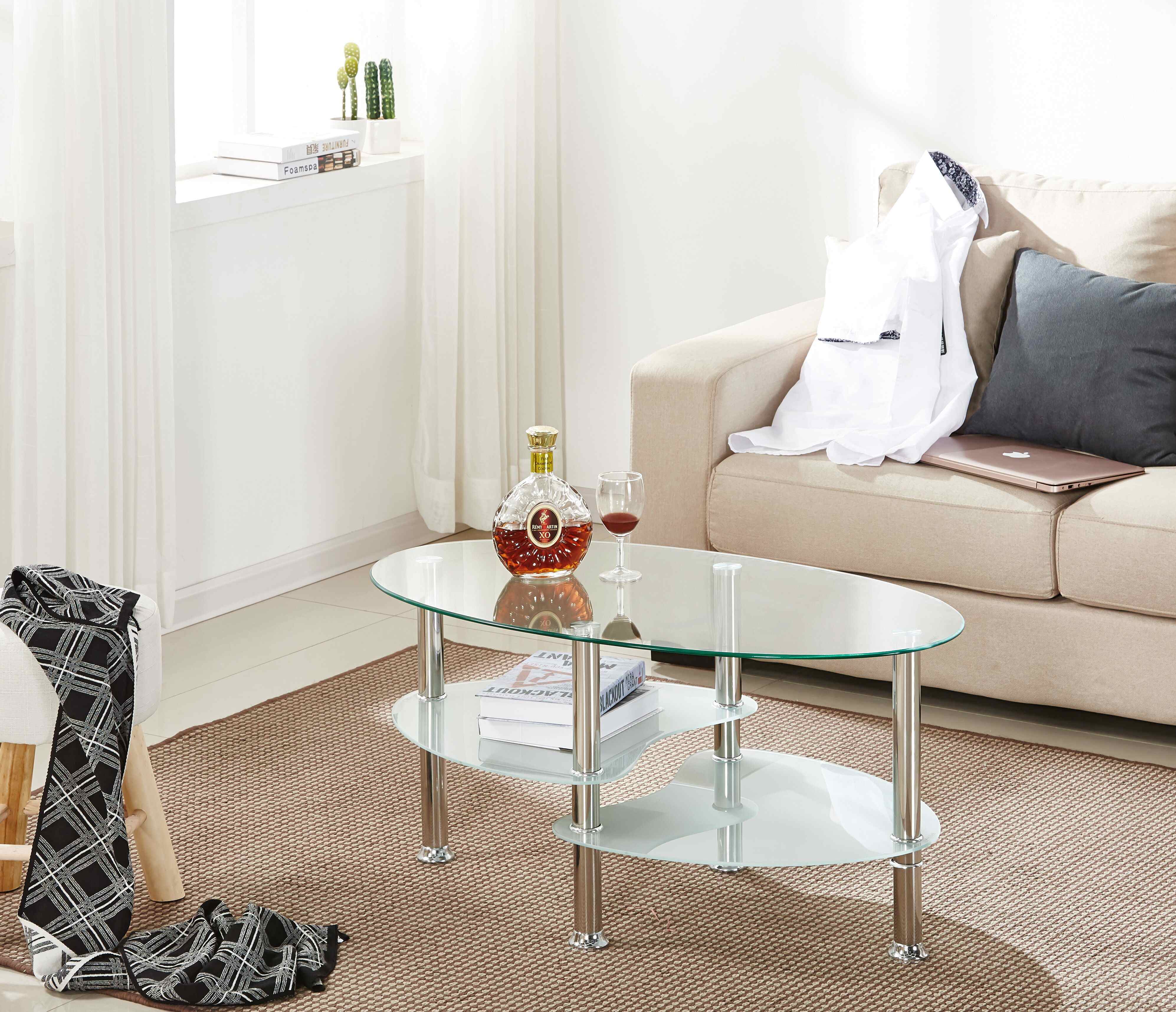 Transforme o seu espaço com a nossa moderna mesa de centro de vidro, onde o design elegante encontra a funcionalidade inteligente. Apresentando uma elegante construção de vidro duplo (parte superior transparente de 6 mm + camada intermediária jateada de 5 mm) e pernas de aço inoxidável polido, oferece elegância moderna e suporte robusto. A prateleira de armazenamento oculta mantém os itens essenciais arrumados, enquanto seu tamanho compacto de 90x50x43cm a torna perfeita para espaços pequenos ou cantos aconchegantes. Seja na sua sala de estar, quarto ou recanto de leitura, esta mesa oval combina perfeitamente com qualquer estilo: minimalista, contemporâneo ou acolhedor e convidativo. Durável, fácil de limpar e refletivo de luz, é a atualização fácil que sua casa precisa.